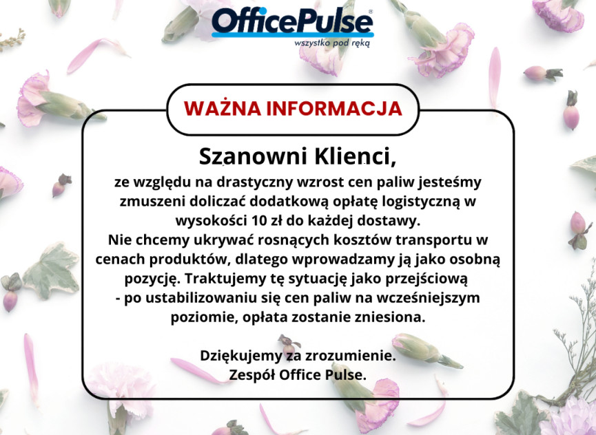 ze względu na drastyczny wzrost cen paliw jesteśmy zmuszeni doliczać dodatkową opłatę logistyczną w wysokości 10 zł do każdej dostawy. Nie chcemy ukrywać rosnących kosztów transportu w cenach produktów, dlatego wprowadzamy ją jako osobną pozycję. Traktujemy tę sytuację jako przejściow- po ustabilizowaniu się cen paliw na wcześniejszym poziomie, opłata zostanie zniesiona.