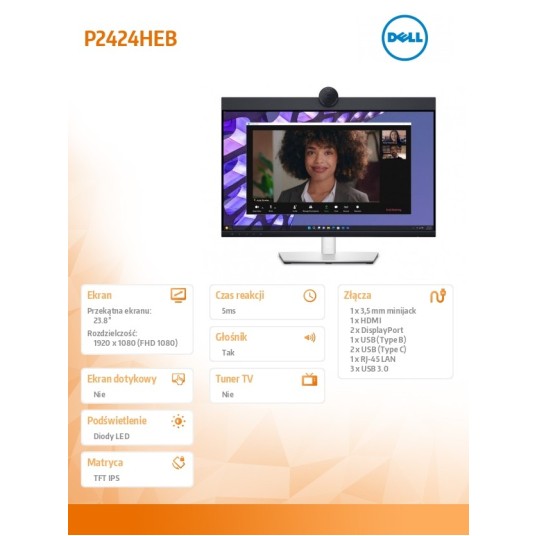 Monitor P2424HEB 23.8 cala LED IPS Full HD (1920 x1080)/16:9/HDMI/DP/ RJ-45/Kamera/Głośniki/Mikrofon/3YPPG