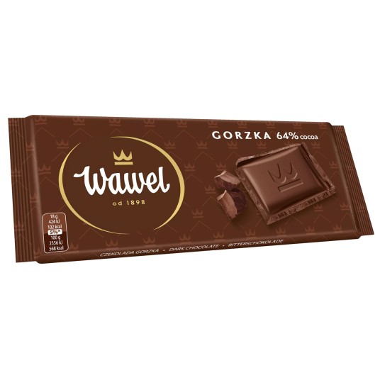 Klasyczna gorzka czekolada o wysokiej zawartości kakao (64%), dla osób, które cenią wyraźny smak i intensywny aromat. Dobrze sprawdza się jako dodatek do kawy w biurze, drobny poczęstunek na spotkaniach lub szybka przekąska w ciągu dnia.