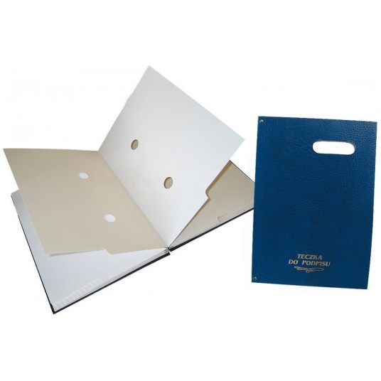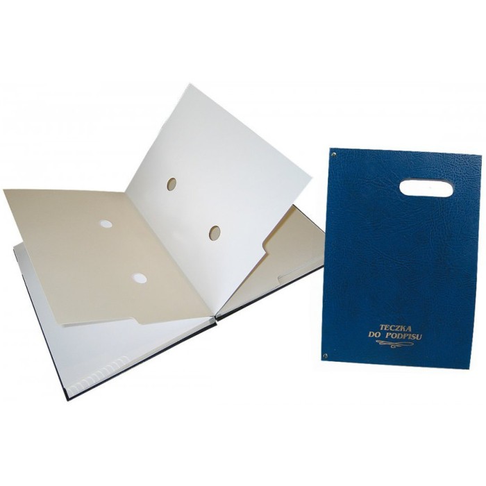 Teczka do podpisu z okienkiem Warta_- okładka twarda oklejana. Grzbiet harmonijka. Łączenie okładki z blokiem wzmocnione nitami. Na przedniej okładce okienko z szybką, pod którą można umieszczać napisy. _- blok z kartonu barwionego w masie zawiera 20 kart z 2 otworami i wyciętymi registrami_- jednostka sprzedaży 1 sztuka