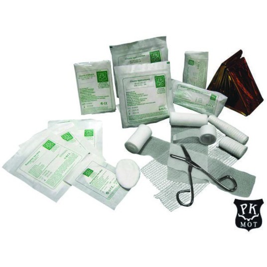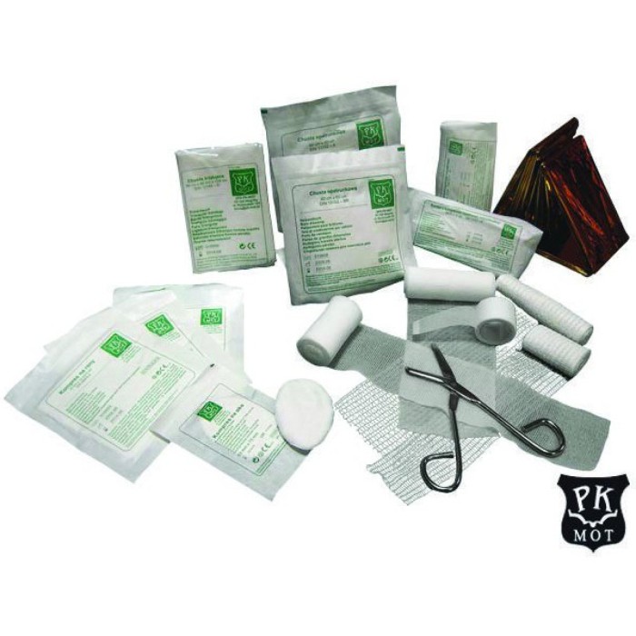 Podstawowe wyposażenie do apteczek. wyposażenie dla apteczek: AS20, AS30, AS40, AZP10, AZP110, AZP15, AZP20, ASA, ASAC, ASAm, AZ , AZR, AS-MINIMIN 14-częściowy zestaw plastrów z opatrunkiem: 6x10 cm (4 szt.), 4,3x7,2 cm (2 szt.), 12x2 cm (2 szt.), 1,9x7,2 cm (2 szt.), 2,5x7,2 cm (4 szt.) plaster na szpulce 5 m x 2,5 cm (1 szt.) bandaż elastyczny 4 m x 6 cm (2 szt.) bandaż elastyczny 4 m x 8 cm (3 szt.) rękawiczki winylowe (2 pary) chusteczki nasączone (2 szt.) chusta opatrunkowa 60x40 cm (1 szt.) chusta opatrunkowa 60x80 cm (1 szt.) bandaż z kompresem (opatrunek indywidualny) 6x8 cm (1 szt.) bandaż z kompresem (opatrunek indywidualny) 8x10 cm (2 szt.) bandaż z kompresem (opatrunek indywidualny) 10x12 cm (1 szt.) kompres na rany 10x10 cm (6 szt.) chusta trójkątna 96x96x136 cm (2 szt.) opaska dziana 4 m x 5 cm (3 szt.) opaska dziana 4 m x 10 cm (2 szt.) opaska dziana 4 m x 15 cm (1 szt.) koc termiczny 160x210 cm (1 szt.) nożyczki (1 szt.) kompres na oko 5x7,5 cm (1 szt.) instrukcja udzielania pierwszej pomocy a