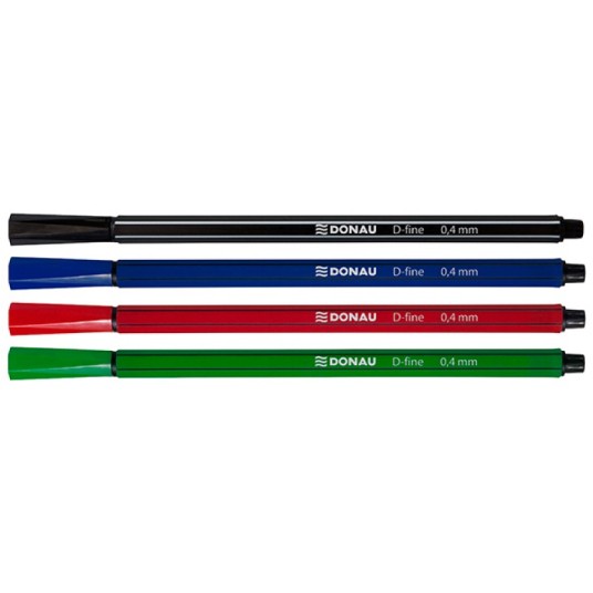 fibrowa końcówka oprawiona w metal obudowa w kolorze tuszu o heksagonalnym kształcie i paskami w wzdłuż obudowy, w kolorach obudowy: czerwonym, niebieskim, zielonym- pasek koloru czarnego, w czarnym kolorze obudowy pasek koloru szarego wentylowana skuwka w kolorze tuszu o heksagonalnym zakończeniu tusz na bazie wody, odporny na wysychanie bezzapachowy nietoksyczny długość linii pisania: 500-600m linia pisania: 0,4mm końcówka: 0,4mm na każdym cienkopisie nazwa modelu D-fine, marki Donau oraz grubość 0,4mm idealny do tworzenia kolorowych notatek, pracy z szablonem itp. do użytku w biurze, szkole oraz w domu opakowanie: 4 kolory kolor: mix kolorów