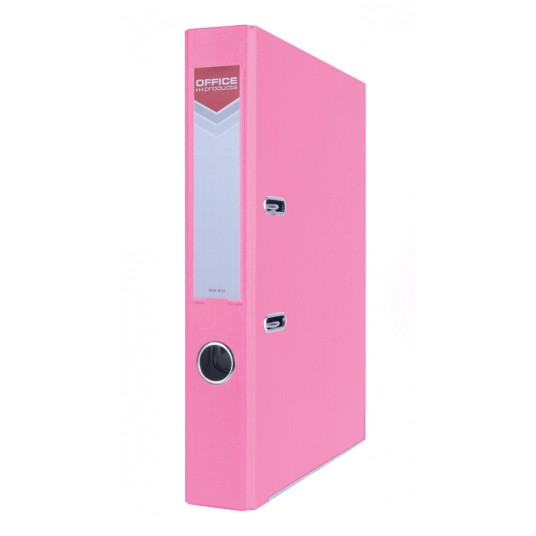 segregator A4, wysokiej jakości, wykonany z kartonu o grubości 1,9mm i gramaturze 1170gsm, ze wzmocnioną dolną krawędzią (metalowa listwa) pokryty matową folią polipropylenową (100µm) - o płóciennej strukturze wewnątrz wyklejka papierowa o szarym zabarwieniu - odporna na zabrudzenia dwustronna, wymienna etykieta grzbietowa mechanizm dźwigniowy najwyższej jakości szerokość grzbietu: 55mm wymiary: 55x320x285mm 5 lat gwarancji na mechanizm kolor różowy