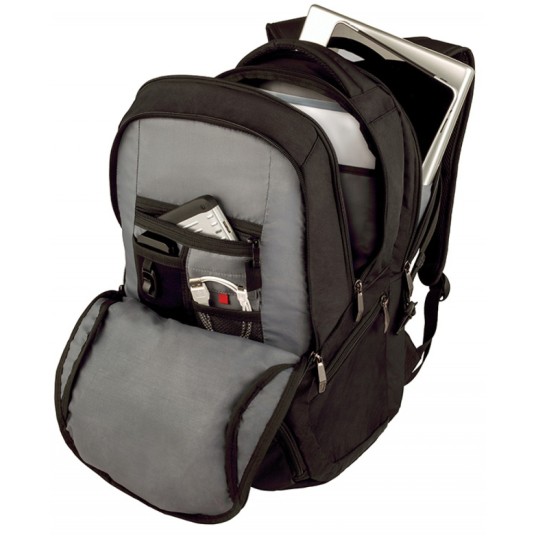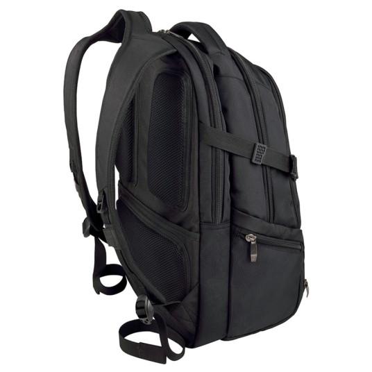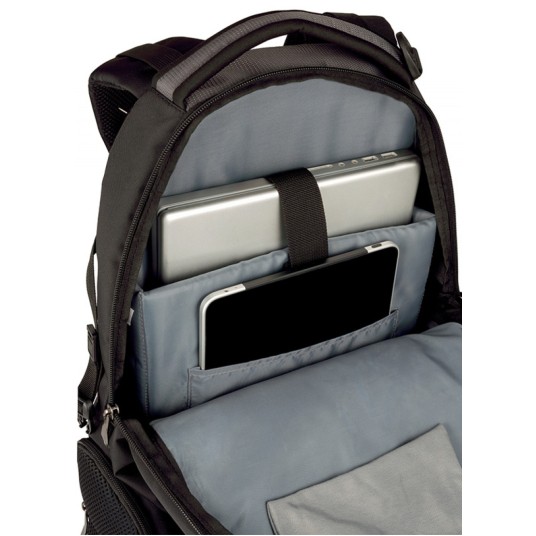 usztywniona przegroda na laptopa 16"/41cm oraz dedykowana kieszeń na tablet/czytnik 10"/25cm platforma stabilizująca CaseBase utrzymuje plecak w pozycji pionowej tylna wyściółka umożliwiająca przepływ powietrza sprawia, że użytkownik utrzymuje swoją temperaturę paski naramienne zapewniające komfort organizator na niezbędne akcesoria kieszenie boczne z zamkiem błyskawicznym pasek Pass-Thru wsuwa się na system uchwytu bagażu na kółkach, ułatwiając dzięki temu podróżowanie waga: 1,05kg pojemność: 27L wymiary: 350x460x270mm materiał: poliester gwarancja: 3 lata kolor: czarny