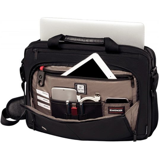 usztywniona przegroda na laptopa 16"/41cm oraz dedykowana kieszeń na tablet/czytnik 10"/25cm z wyściółką zapobiegającą zarysowaniom podwójne przegrody rozdzielacz na dokumenty organizator na niezbędne akcesoria kieszeń Quik Pocket zapewniająca łatwy dostęp do niezbędnych akcesoriów regulowany miękki pasek na ramię wyściełane uchwyty zamek błyskawiczny tylnej kieszeni można rozpiąć, aby powstał pasek Pass-Thru ułatwiający podróżowanie z bagażem na kółkach waga: 0,99kg pojemność: 8L wymiary: 410x280x120mm materiał: nylon/PVC/poliester gwarancja: 3 lata kolor: czarny