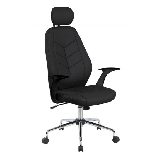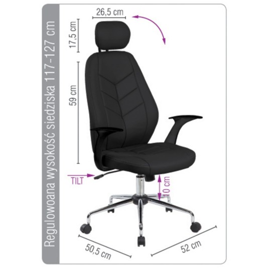ergonomiczny fotel biurowy z mechanizmem typu TILT możliwość swobodnego kołysania oraz blokady pozycji do pracy regulacja wysokości siedziska w zakresie: 117-127 cm komfortowe i ergonomiczne oparcie ze zintegrowanym zagłówkiem w rozmiarze 26,5 x 17,5 cm wykonane z ekoskóry plastikowe podłokietniki stalowa podstawa rekomendowane maksymalne obciążenie: 100 kg szerokość siedziska: 52 cm (w najszerszym punkcie) głębokość siedziska: 50,5 cm (w najszerszym punkcie) szerokość oparcia: 52 cm (w najszerszym punkcie) wysokość oparcia: 59 cm (wysokość robocza) kolor: czarny