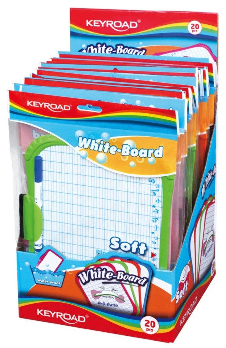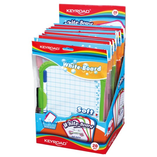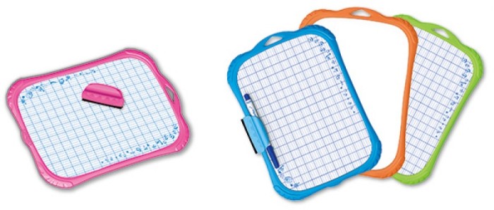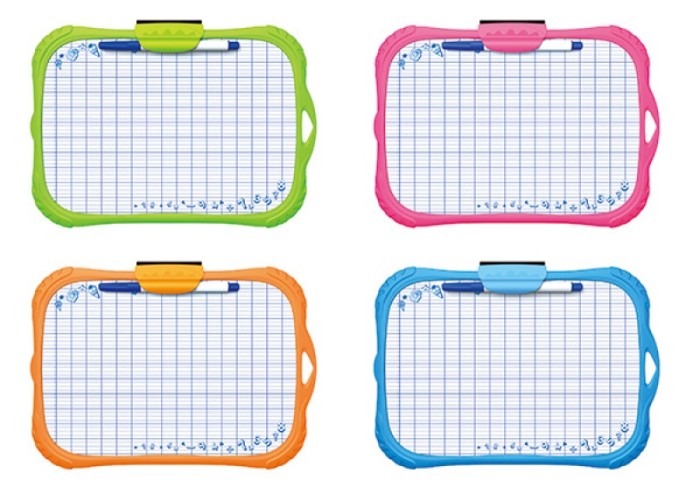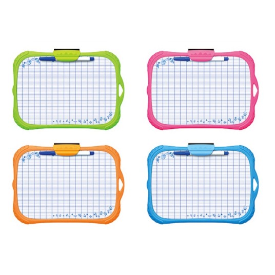 tablica suchościeralna dla dzieci dwustronna (gładka / w kratkę) powłoka zapobiegająca pęknięciom, flexi, zmywalna kolorowe, gumowe ramki w zestawie marker oraz mini-gąbka uchwyt do zawieszania rozmiar: 205x287x17mm kolor tablicy: biały kolor ramki: mix kolorów