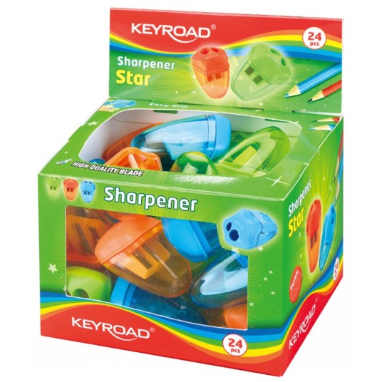 Temperówka KEYROAD Star, plastikowa, podwójna, z pojemnikiem, pakowane na displayu, mix kolorów