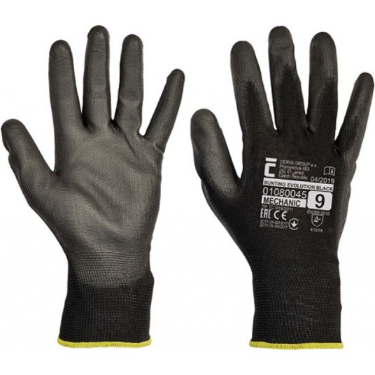 dziane, bezszwowe, poliestrowe rękawice z cienką warstwą poliuretanu w części chwytnej dłoni i na palcach z elastycznym ściągaczem rozmiar: 8 kolor: czarny