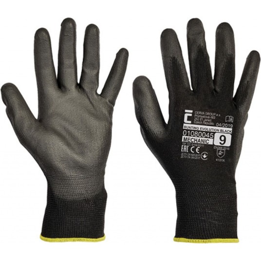 dziane, bezszwowe, poliestrowe rękawice z cienką warstwą poliuretanu w części chwytnej dłoni i na palcach z elastycznym ściągaczem rozmiar: 10 kolor: czarny