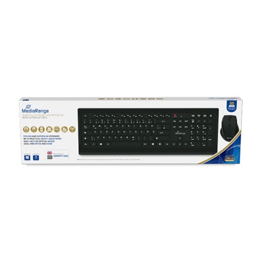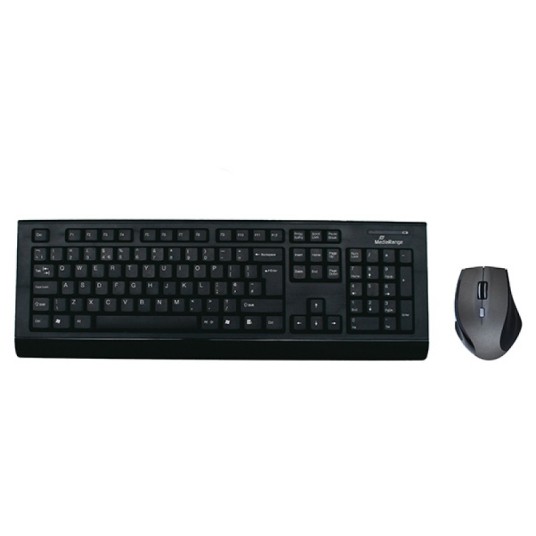 Układ klawiatury: QWERTY (Wielka Brytania) Połączenie: nanoodbiornik USB 2.0 2,4 GHz, bezprzewodowy, ok. Odległość robocza 10 m 10 milionów naciśnięć klawiszy Odporny na zachlapanie Praktyczna regulacja wysokości Kompatybilny z Windows, Mac i Linux Plug & Play Waga (klawiatura): 530 g (bez baterii) Wymiary (klawiatura): 467 x 174 x 26 mm Kolor (klawiatura): czarny Waga (mysz): 60g (bez baterii) Wymiary (mysz): 97 x 70 x 36 mm Kolor (mysz): czarny / szary Wymagane baterie: 1x Mignon AA (Mysz), 1x Micro AAA (klawiatura) Nie zawiera baterii