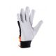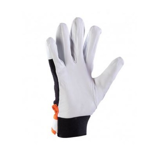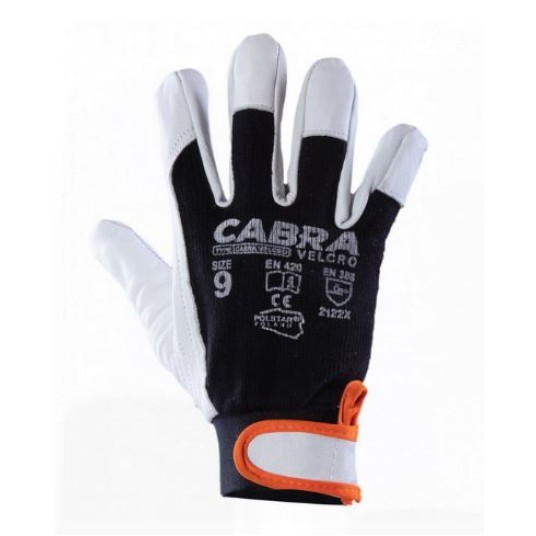 Rękawice robocze wzmacniane skórą znanej marki CABRA model VELCRO Kategoria ochrony I zgodny z normami EN 420:2003 + A1:2009 i EN 388 Wykonane z bardzo delikatnej licowej skóry koziej i niebieskiej bawełnianej dzianiny Interlock zapewniającej komfort użytkowania Część chwytna wykonana z jednego kawałka skóry - rękawice całodłonicowe Kciuk i palec wskazujący wykonany ze skóry Regulacja mankietu przy pomocy elastycznego ściągacza zapinanego na rzep – chroni przed czynnikami zewnętrznymi Bardzo wysoka jakość wykonania