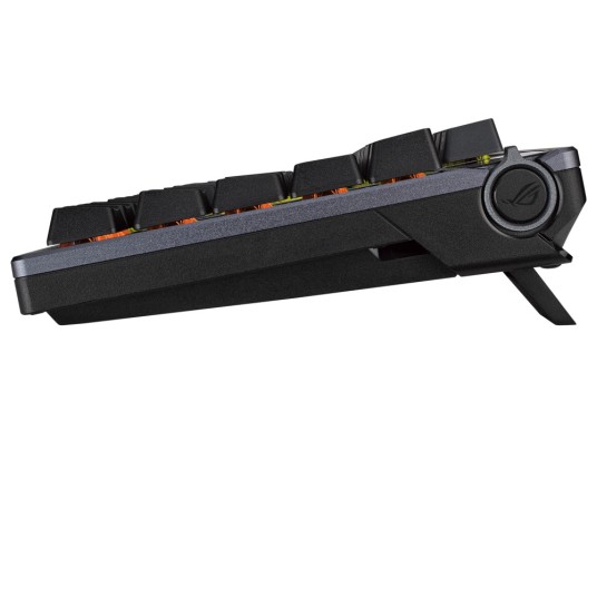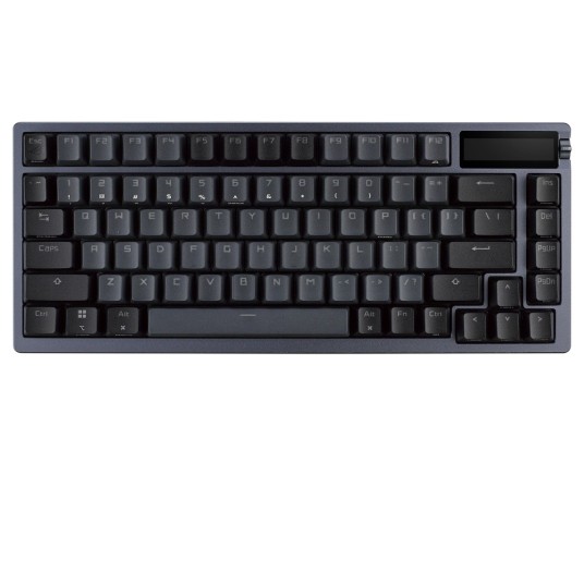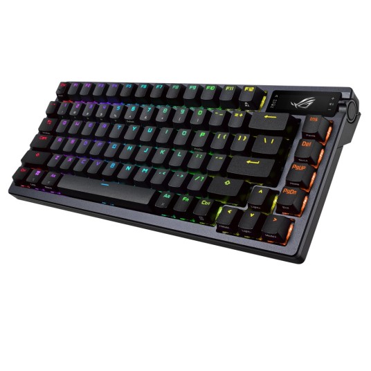 Niestandardowa klawiatura do gier ROG Azoth o współczynniku kształtu 75, mocowaniu na uszczelkę, trójwarstwowej piance tłumiącej i metalowej górnej pokrywie, wysoce konfigurowalna dzięki wstępnie nasmarowanym przełącznikom mechanicznym ROG NX z możliwością wymiany podczas pracy, stabilizatorom klawiatury ROG, podwójnym nasadkom klawiszy z PBT i zestawowi smarowania, trzy -tryb połączenia z technologią 2,4 GHz SpeedNova, wyświetlaczem OLED, trójkierunkowym pokrętłem sterującym, trzema kątami nachylenia i obsługą komputerów Mac