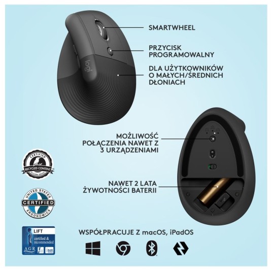 Organiczna sylwetka myszy Lift pasuje jak ulał do małych i średnich dłoni została specjalnie zaprojektowana i wyrzeźbiona przez zespół ekspertów firmy Logitech w dziedzinie ergonomii i wzornictwa.