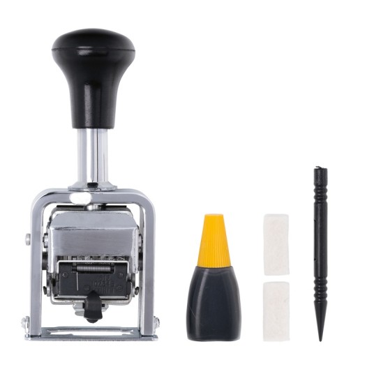 wykonany z metalu z ergonomicznym plastikowym uchwytem funkcja automatycznego numerowania stron co oznacza, że każdy kolejny numer jest większy o jeden funkcja powtarzania: 0, 1, 2, 3, 4, 5, 6, 12 funkcja wolnego pola wysokość czcionki: 4,5 mm wyposażony w blokadę uchwytu w komplecie pojemnik z tuszem, dwa wymienne wkłady, plastikowy przyrząd do regulacji pierścieni kolor: srebrny