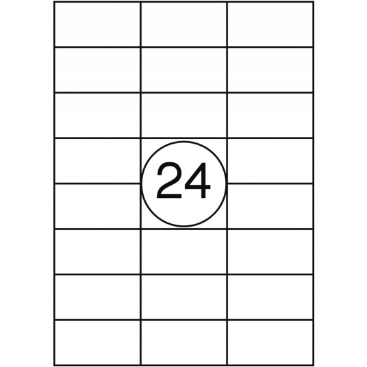 klasyczne etykiety samoprzylepne, odpowiednie do drukarek laserowych, atramentowych i kserokopiarek rozmiar etykiety: 70x37mm liczba etykiet na arkuszu: 24 gramatura: front 70gsm, podkład 75gsm białość: 148 ± 5 CIE QCT - Quatro Clean Technology - ochronne pole wzdłuż krawędzi etykiety, które zapobiega odkładaniu się kleju na mechanizmie drukarki 100 arkuszy w opakowaniu kolor: biały