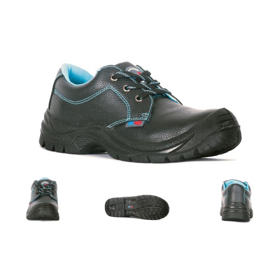 Cholewka z tłoczonej skóry oraz podszewka z oddychającej tkaniny MESH w kolorze niebieskim gwarantują wygodę podczas całodziennego noszenia. Podeszwa PU o podwójnej gęstości, wykonana metodą wtrysku bezpośredniego, jest antypoślizgowa, olejoodporna i antystatyczna, co zwiększa stabilność i bezpieczeństwo na różnych powierzchniach.